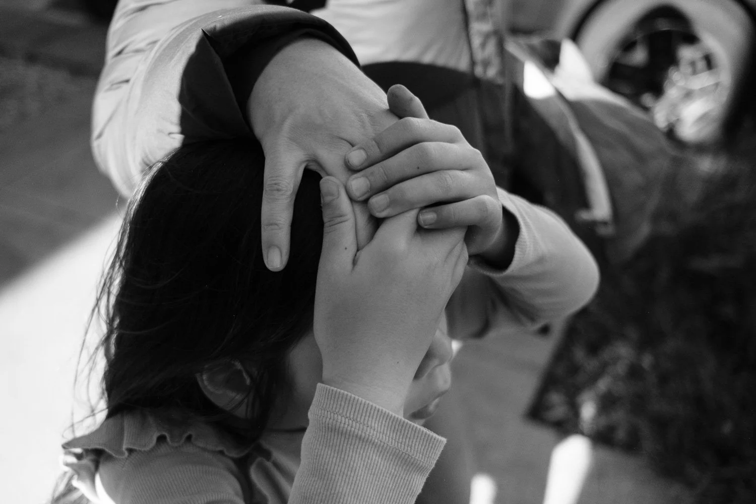 A child puts her mother’s hand on her head while they walk together their neighborhood.